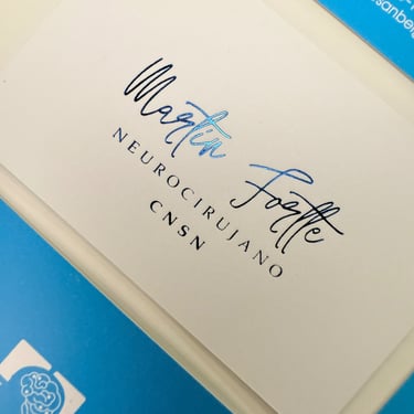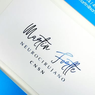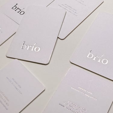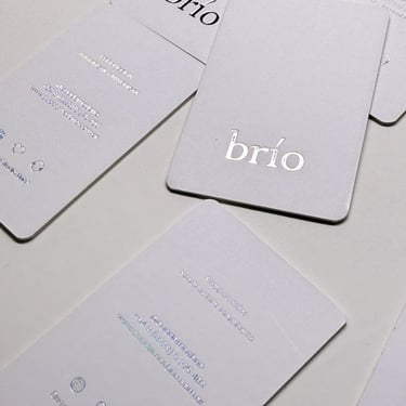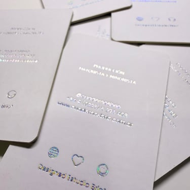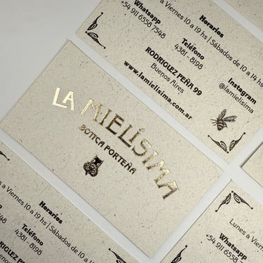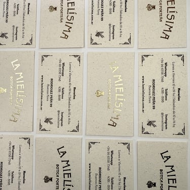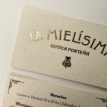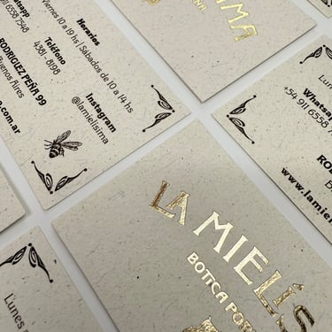 Tarjetas personales realizadas en papel 60% algodón de alto gramaje, con una textura suave y natural que transmite elegancia y carácter artesanal. Combinadas con impresión en tinta a un color y hot stamping, logran una pieza sobria, distintiva y de fuerte presencia visual.