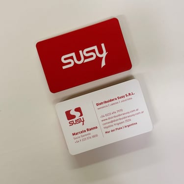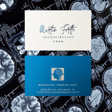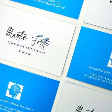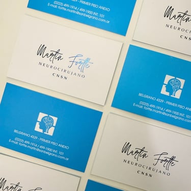 Tarjetas personales montadas de doble espesor, impresas en cartulina triplex con tinta Pantone a un color, logrando una reproducción cromática precisa y uniforme. El laminado mate frente y dorso aporta un acabado sobrio y elegante, ideal para marcas que priorizan identidad visual, solidez y presencia sin incorporar detalles metálicos.